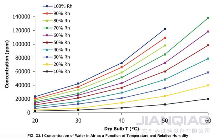 附錄X3中,表3.1是恒定水蒸氣含量下,相對濕度與溫度的關系。而圖3.1是水蒸氣含量、溫度、相對濕度三者之間的關系。在考慮了相對濕度對產品材料的損傷性后,大家可以針對一定溫度建立適宜的相對濕度范圍,進而調整試驗條件。