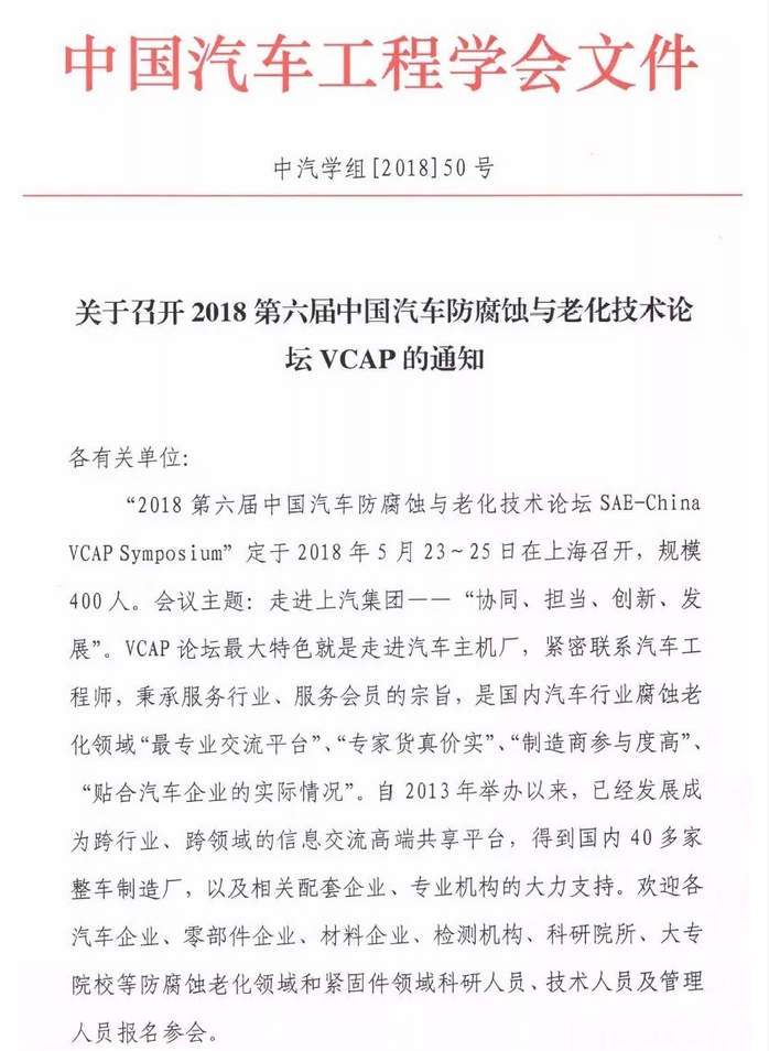 “2018第六屆中國汽車防腐蝕與老化技術論壇SAE-China VCAP Symposium”定于2018年5月23~25日在上海召開,規(guī)模400人。