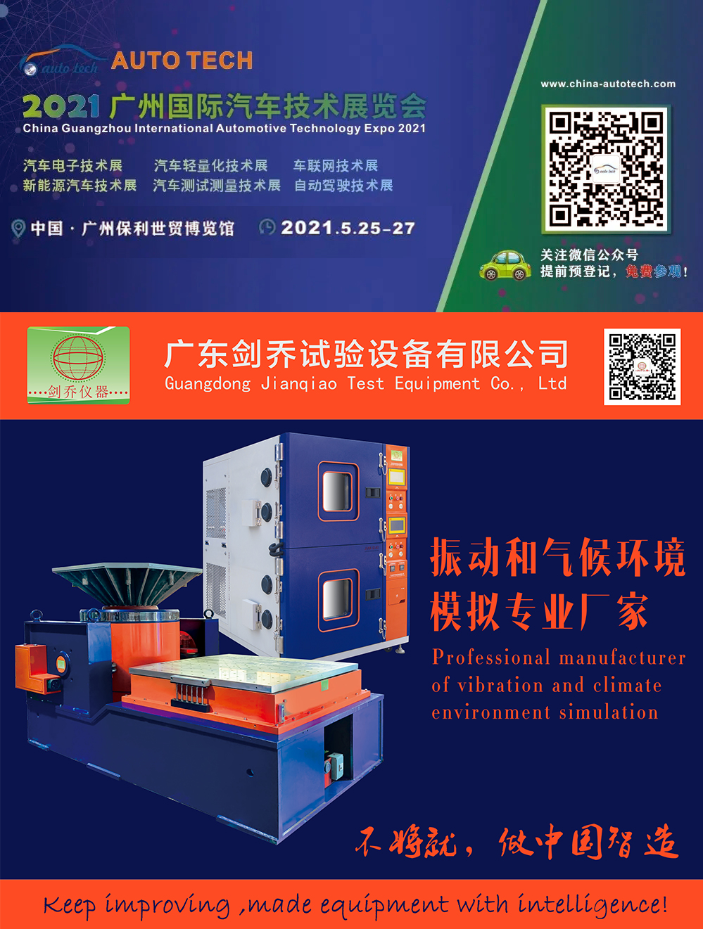 2021年5月25-27日,廣東劍喬試驗設備有限公司【劍喬儀器】將攜旗下最新試驗設備亮相AUTO TECH 2021 中國·廣州第八屆國際汽車技術展覽會,現場展示:振動試驗系統、溫濕度振動三綜合箱、高低溫防爆試驗箱、高加速沖擊試驗臺、電池熱濫用試驗機、電池短路試驗箱、等試驗設備及動力電池相關試驗解決方案。