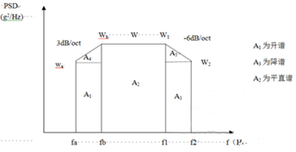 為了簡(jiǎn)便起見(jiàn),往往將功率譜密度曲線圖劃分成若干矩形和三角形,并利用上升斜率(如3dB/oct)和下降斜率(如-6dB/oct)分別算出wa 和w2,然后求各個(gè)幾何形狀的面積與面積和,再開(kāi)方求出加速度總均方根值。